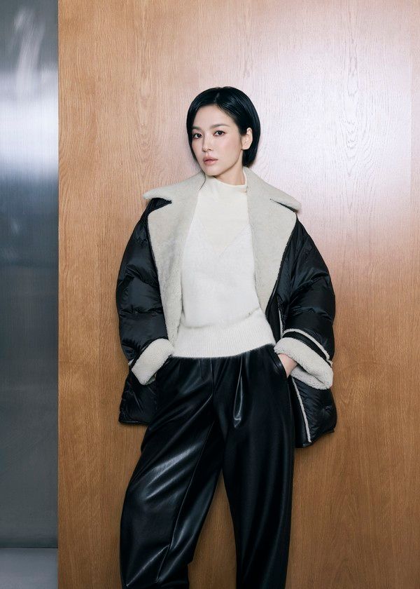 송혜교는 헤링본 패턴의 카라 코트와 양털 디테일이 더해진 패딩을 니트와 가죽 팬츠로 매치해 시크한 무드를 담아냈다.
