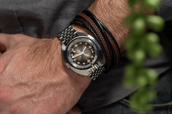 브랜드의 아이코닉한 디자인 요소인 스테인리스 스틸 "비즈 오브 라이스(biz of rice)" 브레이슬릿과 함께 제공되며, 다이빙 수트 위에도 편안하게 착용할 수 있도록 래칫팅 웻수트 익스텐션 기능이 있는 폴딩 버클이 장착되어 있다.(사진 제공 : 독사)