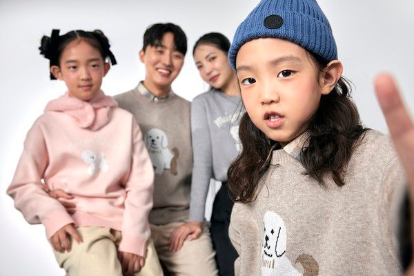 이번 화보는 노르딕 패턴 스웨터와 프로젝트멍 그래픽 스웨터를 중심으로 각 가족의 개성과 분위기에 맞춘 스타일링을 선보였다. 첫 번째 가족은 프로젝트멍 그래픽 스웨터에 체크 패턴 플리츠 스커트와 코듀로이 팬츠를 매치해 밝고 사랑스러운 패밀리룩을 연출했다.