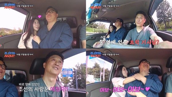 TV CHOSUN 극사실주의 다큐 예능 ‘조선의 사랑꾼’에서 트럭에 함께 탄 윤정수·원진서가 핑크빛 분위기의 팬서비스에 나선다.