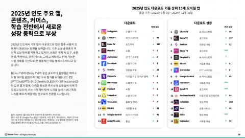 2025년 다운로드 상위 앱은 향후 사용자 모멘텀의 방향을 보여준다. 기존 소셜 플랫폼이 여전히 도달 범위를 유지하는 가운데 성장은 AI 도구, 숏폼 영상, 퀵커머스, 금융 서비스, 학습 앱 등 명확한 사용 목적을 가진 서비스에서 나타나고 있다.