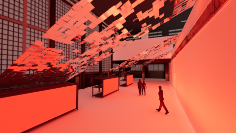 강이연 작가는 피민코 재단의 상징적 공간인 라 쇼프리(La Chaufferie)의 압도적인 규모(높이 14m, 면적 1200㎡)의 공간적 특성을 극대화해 공간 전체를 하나의 거대한 서사로 변모시킨다.
