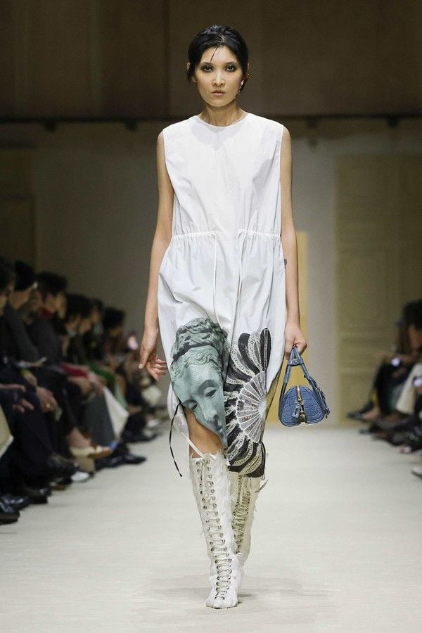 테일러링과 스포츠 웨어, 자수 장식이 더해진 새틴 드레스는 정교하게 레이어링 되고, 서로 대비되는 구성은 충돌하기보다 프라다 고유의 패션 언어를 더욱 또렷하게 선보인다.