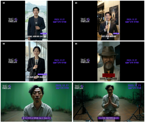 생성형 AI와 인간 창작자의 협업으로 탄생한 옴니버스 영화 <코드: G 주목의 시작>이 AI 배우들의 개봉 인사 영상을 공개하며 개봉을 향한 기대감을 더욱 높이고 있다.[감독 : 김주신, 김영기, 권한슬/홍기선, 송영윤, 김광식 | 제작: MBC C&I/ 디 에이프 스쿼드/ 스튜디오프리윌루전/ MCA | 공동기획/투자 : KT | 배급 : KT스튜디오지니, 영화특별시SMC]