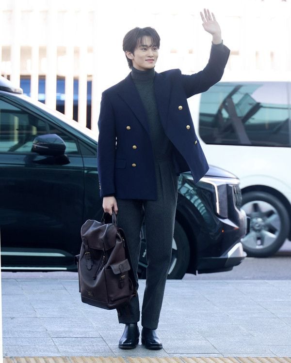 출국에 앞서 마크는 구조적인 울 플란넬 블레이저와 캐시미어 터틀넥 스웨터를 착용해 럭셔리하면서도 클래식한 무드를 연출했다.