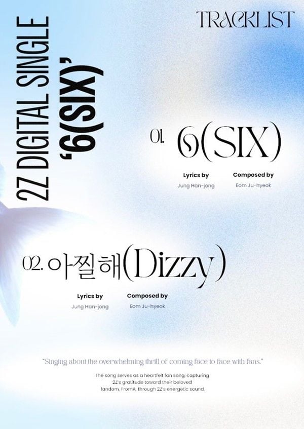 이어 공개된 트랙리스트에 따르면 이번 앨범에는 동명의 인트로 곡 ‘6(SIX)’와 타이틀곡 ‘아찔해(Dizzy)’가 수록됐다. ‘6(SIX)’는 2Z가 지나온 6년의 시간을 '6개의 문'에 비유해 감각적으로 풀어낸 인트로다.