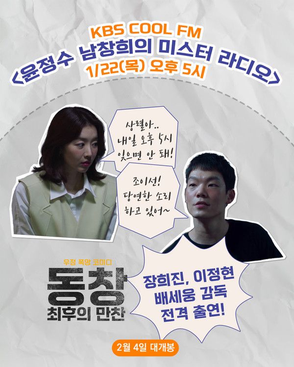 영화 <동창 : 최후의 만찬>의 배세웅 감독과 배우 장희진, 이정현이 KBS Cool FM [윤정수 남창희의 미스터 라디오]에 생방송으로 출연하며 본격적인 영화 홍보에 나선다.