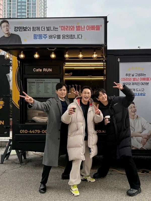 친구들의 응원이 담긴 커피차에 황동주는 KBS 1TV '마리와 별난 아빠들'에 함께 출연하고 있는 배우 류진, 그리고 현우와 장난스런 포즈로 인증샷을 남기며 시선을 사로잡았다.